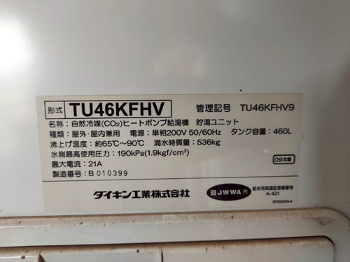 出雲市今市町 ダイキン自然冷媒CO2ヒートポンプ給湯機 貯湯ユニットTU46KFHV→コロナ自然冷媒CO2家庭用ヒートポンプ給湯機貯湯ユニットCTU-37AZ1K、ヒートポンプユニットCHP-DZ451K エコキュート交換工事